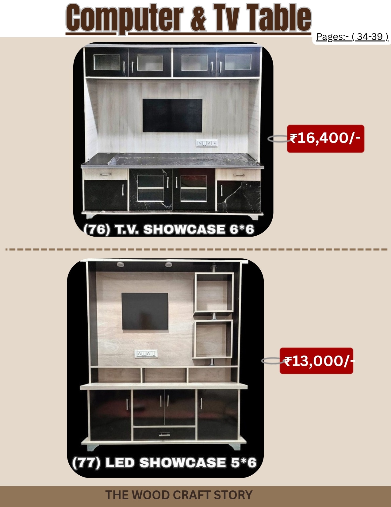 Computer & TV Table Ahmad WOOD Craft https://www.thewoodcraftstory.com Computer Table Features Spacious Surface: Ample space for a desktop, monitor, keyboard, and accessories. Cable Management: Built-in slots or holes for organizing wires neatly. Storage Sections: Drawers, shelves, or CPU stands to keep things tidy. Ergonomic Design: Comfortable height and layout for daily use. Material Options: Available in engineered wood, MDF, or solid wood with laminate or polish finish. 📺 TV Table / Entertainment Unit Features Elegant Design: Complements your living room décor. Multiple Shelves: For set-top box, sound system, or décor items. Cable Management Ports: Keeps wiring hidden for a clean look. Strong Build: Designed to hold heavy LED or LCD TVs securely. 🏠 Common Uses Home offices or study rooms Living rooms and bedrooms Reception areas and small offices 🌟 Benefits Space-saving and multi-purpose Modern and durable construction Easy to assemble and maintain Enhances the look and organization of your room